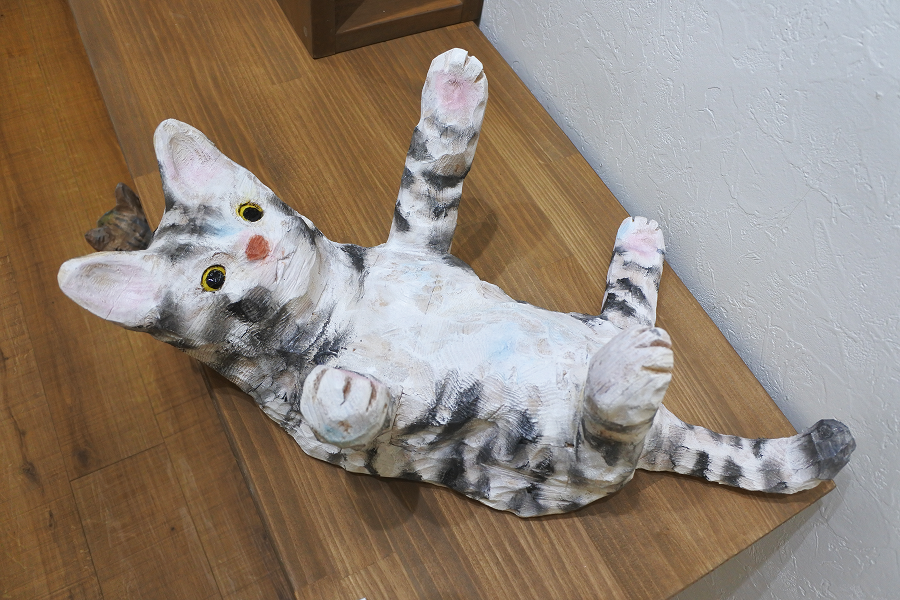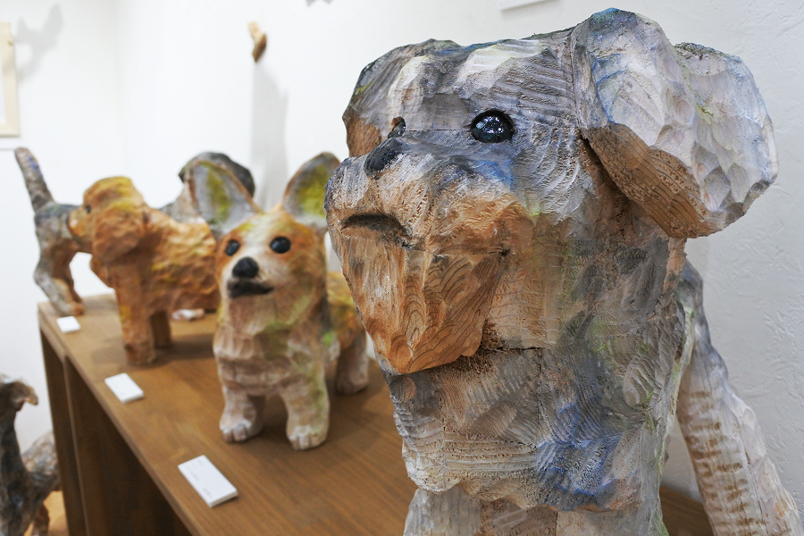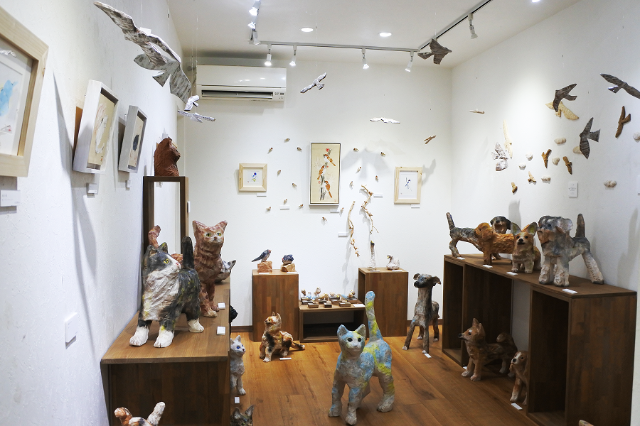 展示スペースにはたくさんの猫、犬、そして鳥。