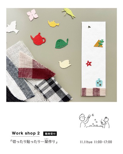 箱崎縞のハギレや小さな切り紙(よしい作)からお好きなものを選び、切ったり貼ったりしながら自分好みの栞を作ります。
