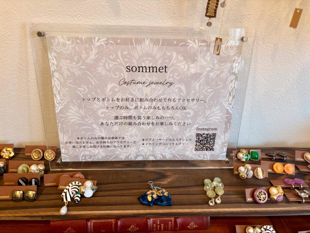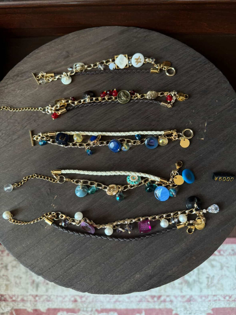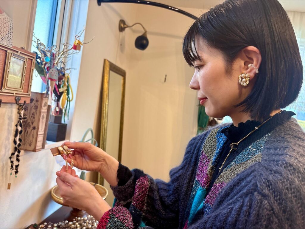 ボタンやヴィンテージアクセサリーをリデザインし、オンラインショップやPOP UP、そしてこのアトリエで販売している。