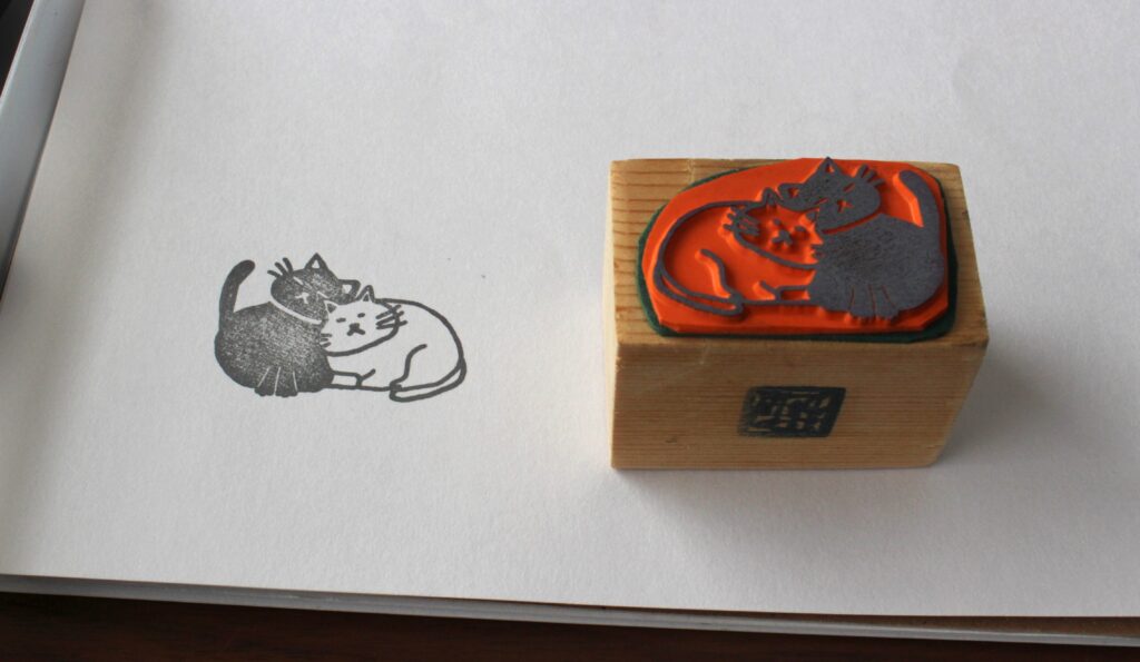 消しゴムはんこは、消しゴムに絵やデザインを描き、彫刻刀などで線を残すように削り、余白を整えた後にインクをのせて、押す——