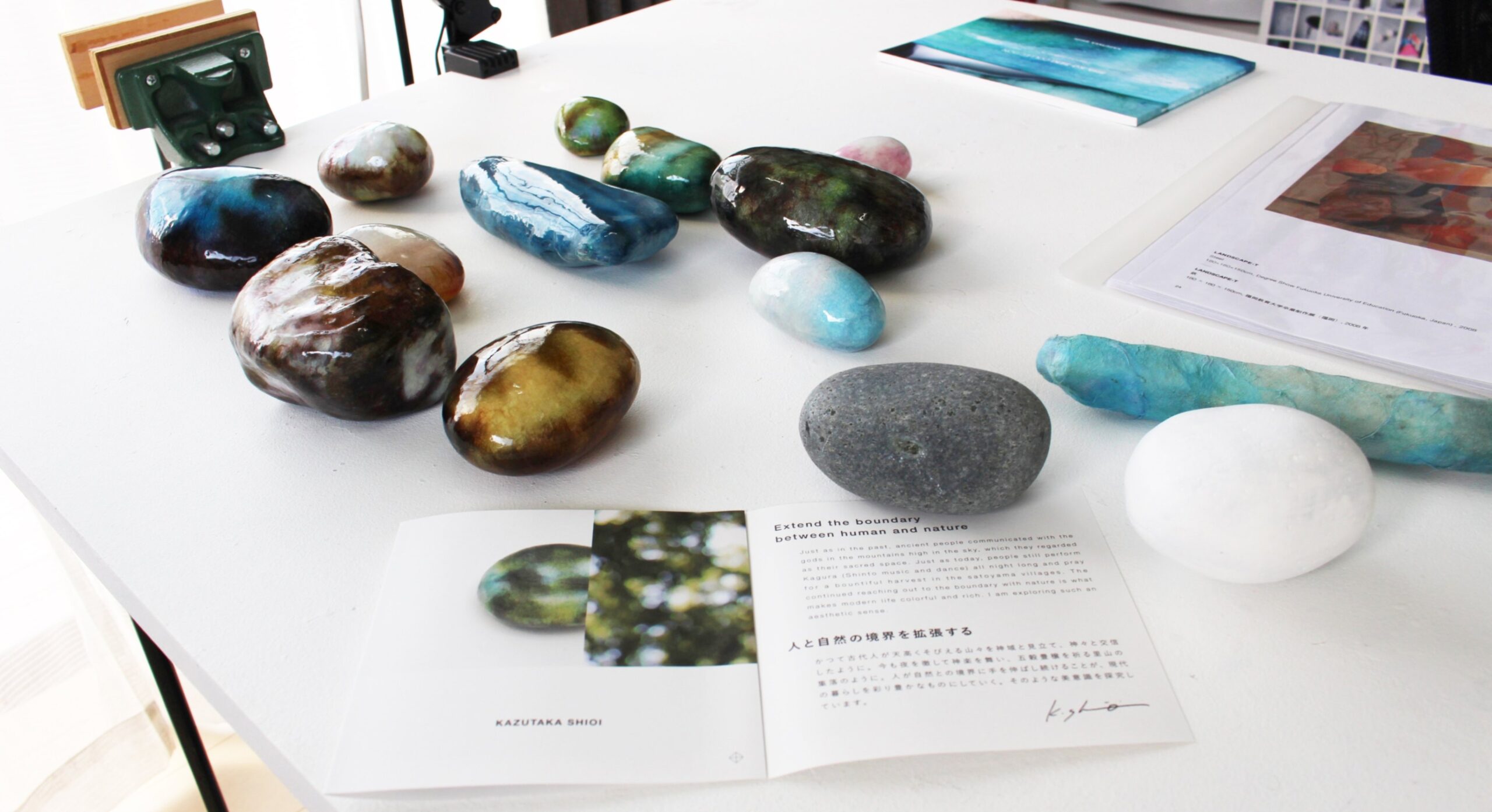 「海の光がとても綺麗だったので、これを触りたいというか家に持って帰りたいというのが最初の着想でした。“光を立体に”と考え、その適切な支持体は何かと探したときに最終的に石に辿り着きました。その前に流木などでも試してみたけど、木だと“木”という形が目立つので、どうしてもそれを見た時の印象が木に引っ張られて純粋な光の表現とは違うなと感じて。でも、石だと抽象的。だから光が立体になった時に自然な形だなと直感しました。それに石だとしっかりと重い。光という重力のないものに重力が与えられることで光に価値がある、とより感じられるのではないかと思っています」
