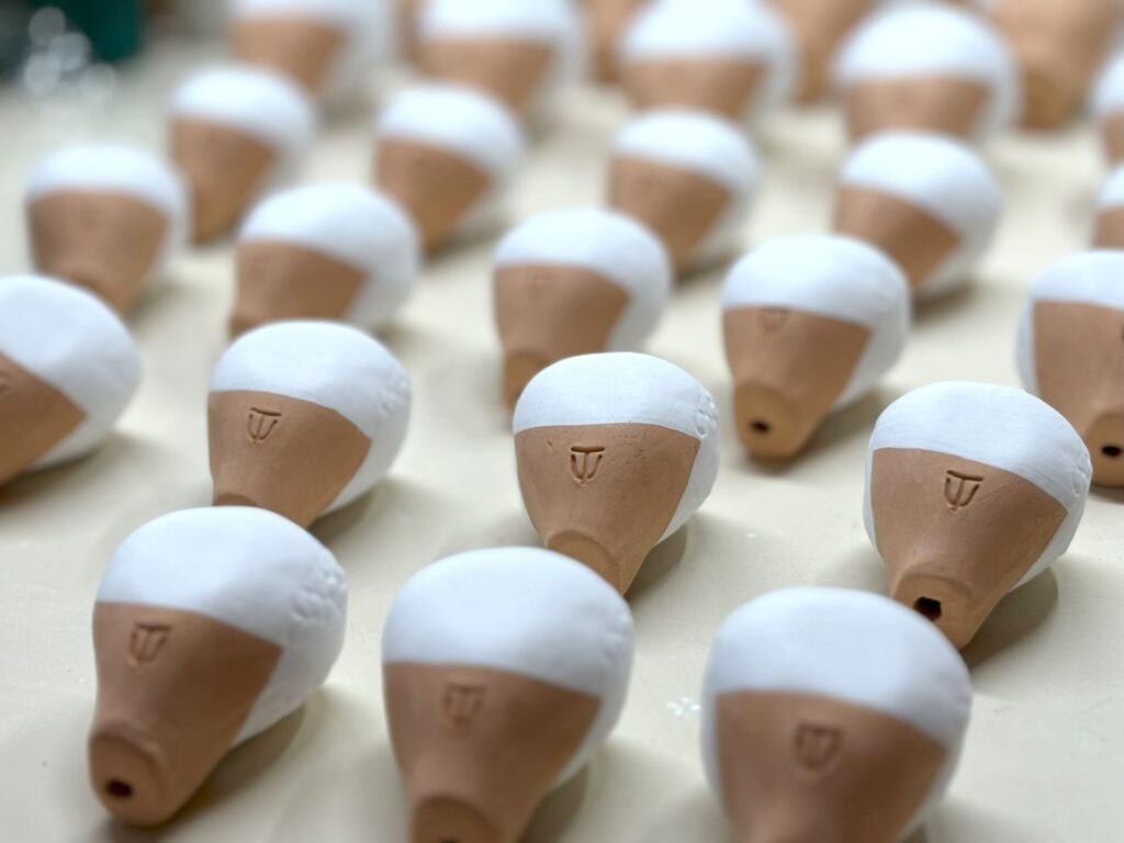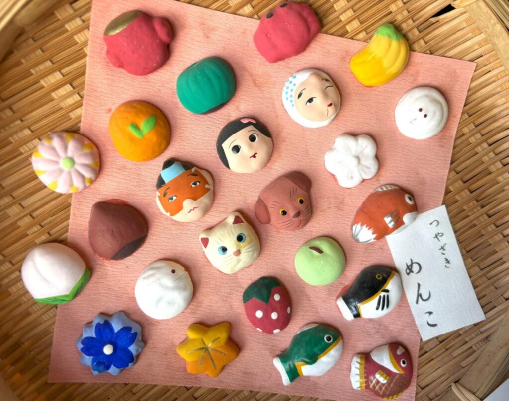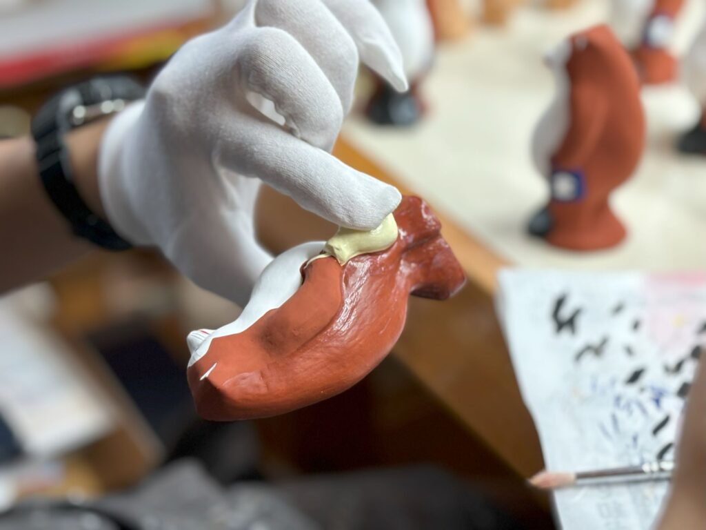古博多人形の流れをくみ、二枚型を合わせて作る手押し製法でひとつひとつが手作業で作られる。豊かな色彩に素朴な土のぬくもりを感じる人形は、福岡に暮らしていれば一度は目にしたことがあるだろう。土型には縁起物として愛されて来たモマ笛(江戸時代)や、おしゃぶり人形として始まったごん太(明治時代)など、1000点以上もあり今も大切に守られている。
