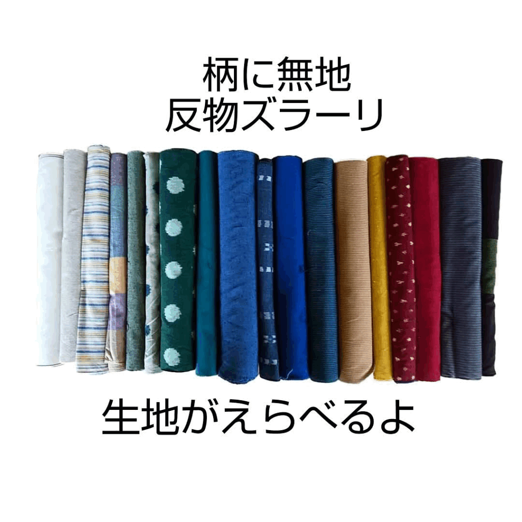 柄に無地、色とりどりの反物生地をずらーり並べて