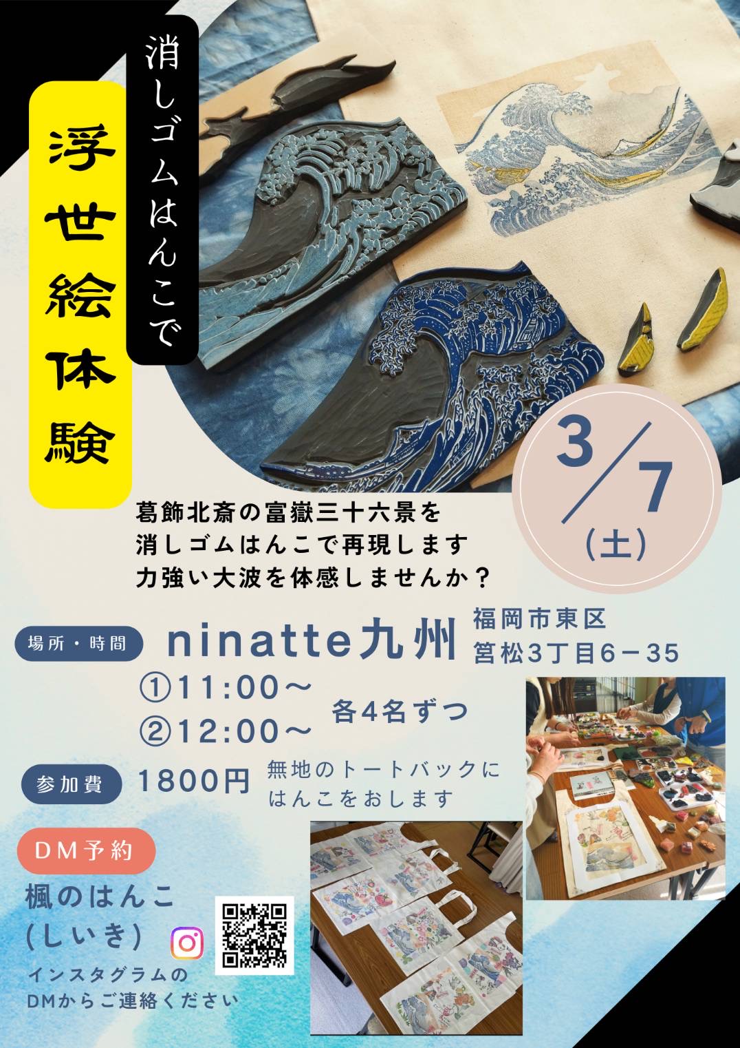 消しゴムはんこ作家の『楓のはんこ』さんが、ninatte九州の事務所(旧梅乃湯)でワークショップを開催されます。