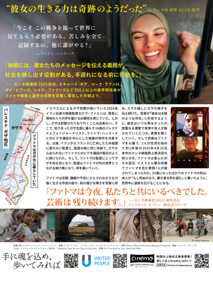 3月14日(土)に、映画『手に魂を込め、歩いてみれば』の上映トークイベントを福岡市美術館で開催します。上映後には、本作配給会社、ユナイテッドピープル代表の関根健次がアフタートークを行い、ガザ地区の現状や私たちに出来ることをテーマにお話します。